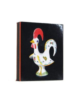 Caixas em cartão e caixas cerâmicas. As caixas de cartão tem desenhos de gastronomia portuguesa como a sardinha e o pastel de nata, o eléctrico, o galo entre outros